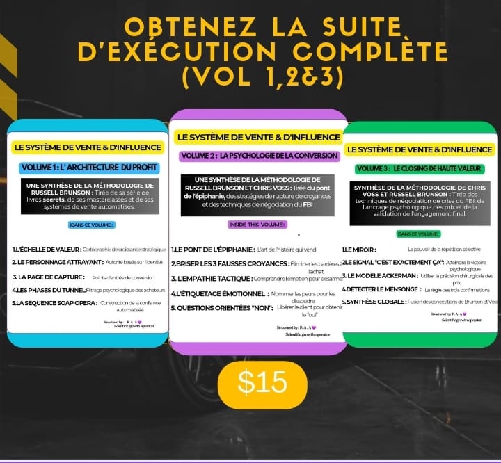 Avis juridique : Cette plateforme et ses protocoles d'application sont des produits indépendants. Ils ne sont pas affiliés, approuvés ou sponsorisés par Russell Brunson, ClickFunnels, ou Chris Voss. Toutes les marques, logos et concepts originaux restent la propriété exclusive de leurs détenteurs respectifs. Ces outils sont conçus comme des cadres compagnons à utiliser parallèlement aux ouvrages officiels disponibles sur Amazon.