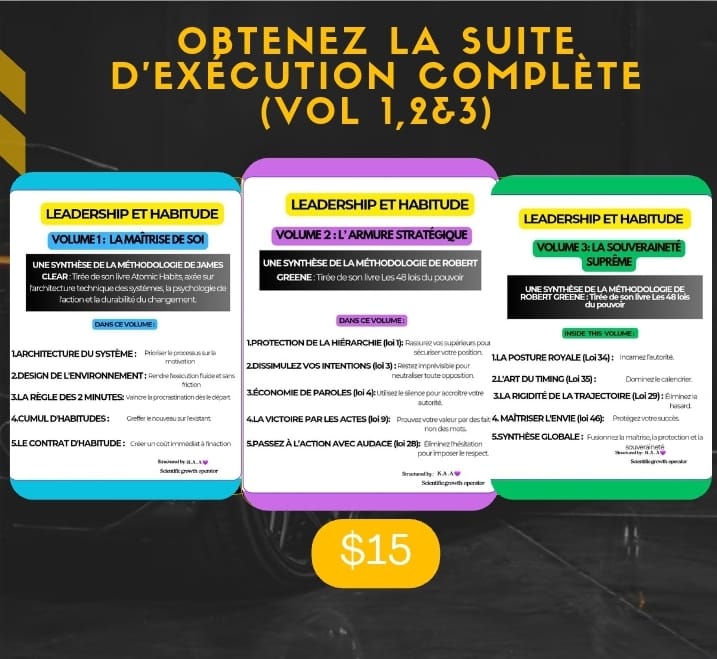 Avis juridique : Cette plateforme et ses protocoles d'application sont des produits indépendants. Ils ne sont pas affiliés à, approuvés par ou sponsorisés par James Clear, Atomic Habits, Robert Greene ou Les 48 Lois du Pouvoir. Toutes les marques commerciales, logos et concepts originaux restent la propriété exclusive de leurs propriétaires respectifs. Ces outils sont conçus comme des cadres de travail complémentaires à utiliser parallèlement aux livres officiels disponibles sur Amazon.