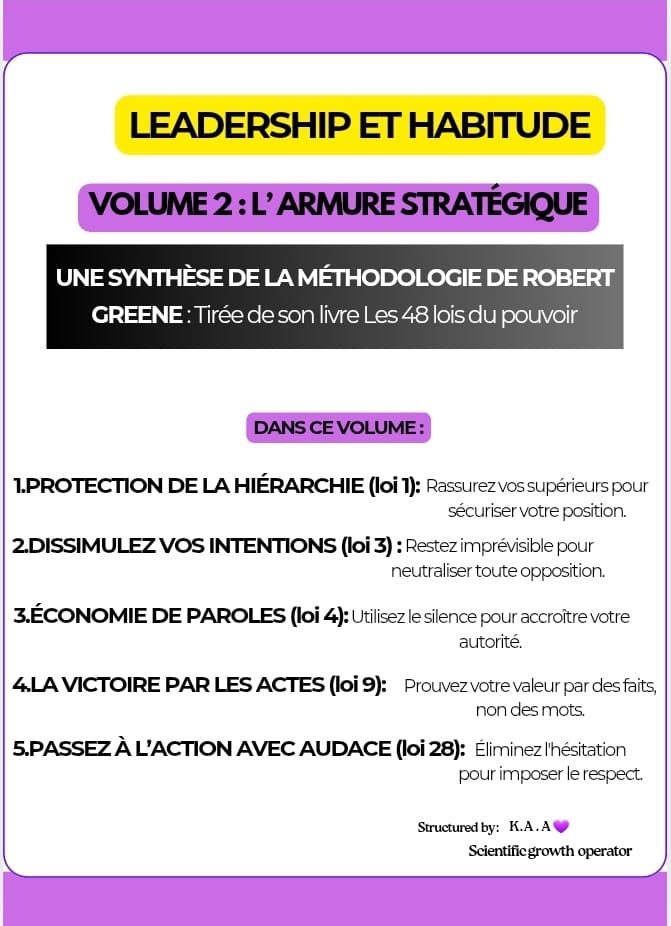 Ce protocole est le cadre technique essentiel pour déployer la méthodologie de Robert Greene avec une rigueur chirurgicale. Plus qu'un simple outil de soutien, il s'agit d'un flux de travail structuré (check-lists, fiches d'ingénierie, étapes d'exécution) conçu pour organiser votre défense stratégique. Le volume 2 est votre compagnon d'installation, dédié au verrouillage des piliers fondamentaux de votre autorité et de l'état d'esprit de puissance. Arrêtez d'être vulnérable : cryptez votre stratégie.