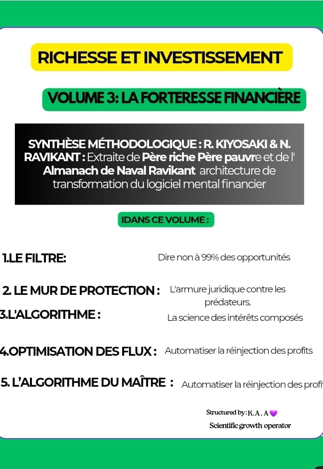 Ce protocole s'inscrit dans la continuité directe du volume 2. Ici, nous extrayons les leviers de protection et d'intérêts composés les plus puissants des systèmes Kiyosaki et Naval pour les injecter dans votre héritage à long terme. Le volume 3 sert de guide d'alignement stratégique pour fluidifier votre processus de sécurité et cimenter votre souveraineté financière totale. Arrêtez de gagner : automatisez la défense et la croissance de votre empire.