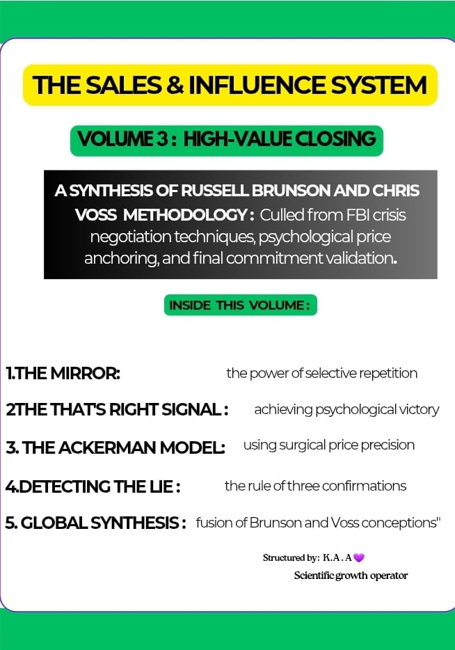 This protocol follows the direct continuity of volume 2. Here, we extract the most powerful negotiation levers from the FBI techniques to inject them into the final stage of your sales process. Volume 3 serves as a strategic alignment guide to streamline the closing phase and cement your prospects' final commitment. Stop selling: secure a surgical agreement.