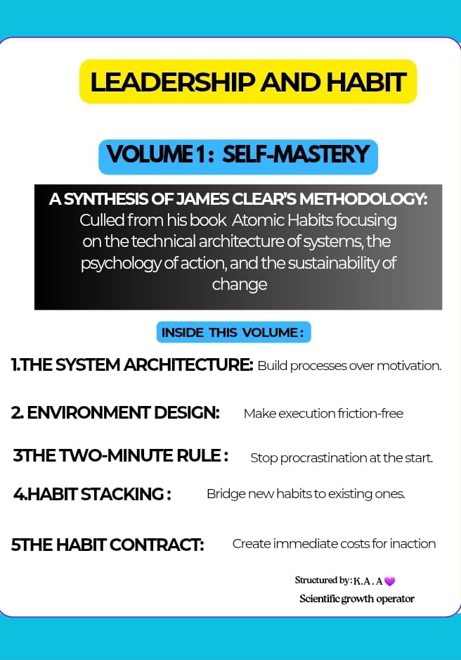 This protocol is the essential technical framework for deploying James Clear’s methodology with surgical rigor. More than just a support tool, it is a structured workflow (checklists, engineering sheets, execution stages) designed to organize your daily discipline strategy. Volume 1 is your installation companion, dedicated to locking in the fundamental pillars of your self-mastery and the systems mindset. Stop relying on motivation: make excellence a technical habit.